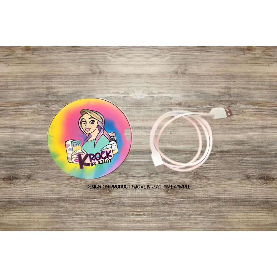 Introducing our wireless phone charging pads. These sublimation wireless phone charging pads are completely customizable. They measure 4 inches in diameter. Comes with a USB cable.